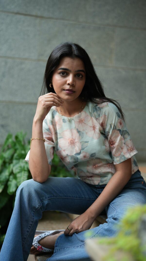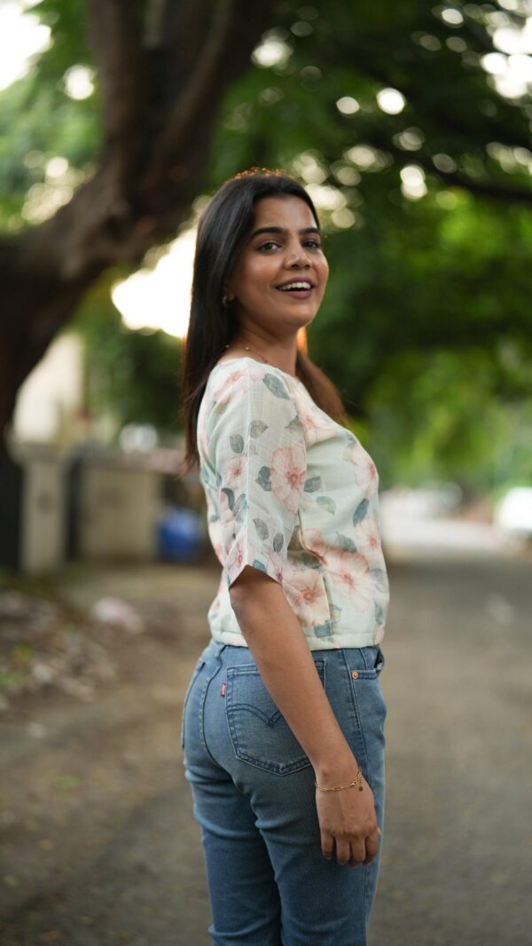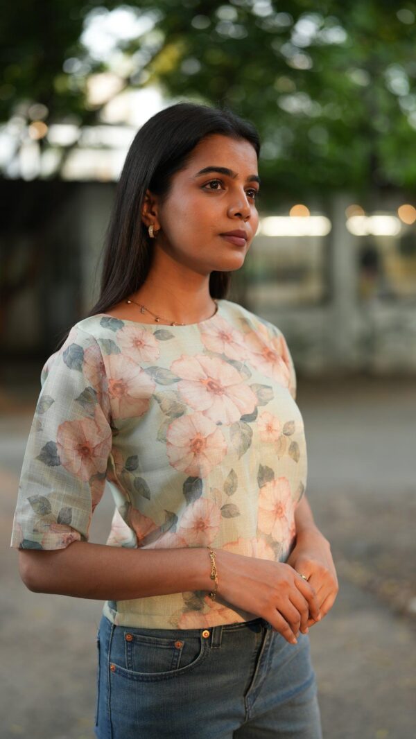 Linen tissue closed neck top with elbow sleeves, perfect for a breezy evening date!