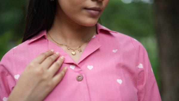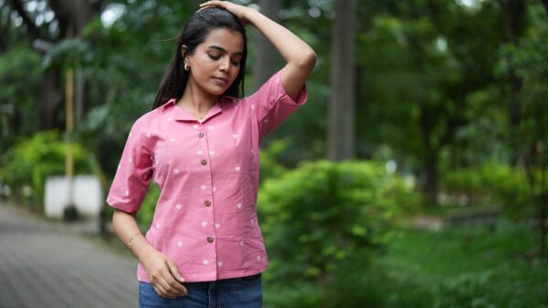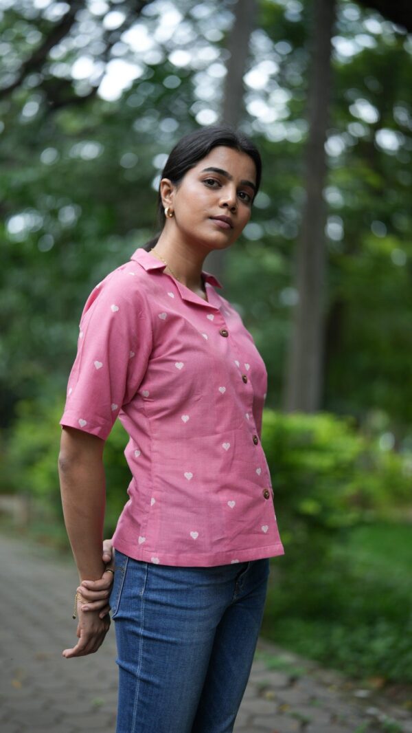Pink handloom shirt with lapel collar, highlighted with wooden buttons and white heart shaped work, wow so pretty <3